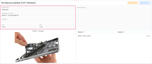 Obrazovka obsahuje přehled informací ke zvolené výrobní operaci a lze ji vyvolat z celé řady obrazovek Výrobního terminálu. Je rozdělena do čtyř částí. Levá horní část obsahuje základní informace o operaci a pokud nějakou informaci není chtěné zobrazit, lze ji skrýt v parametrech aplikace.