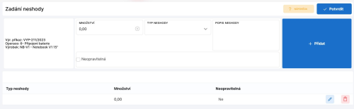 Povinná pole jsou Množství zmetků a Typ neshody, následně lze doplnit Popis neshody a informaci, jestli je závada neopravitelná. Po zadání potřebných údajů se lze kliknutím na tlačítko Potvrdit vrátit zpět na obrazovku Odvádění práce. Nicméně k uložení Neshodné výroby dochází až při ukládání odvodu výroby a zadanou neshodu lze tedy před uložením odvodu kdykoliv editovat opětovným kliknutím na tlačítko Zadat zmetky.