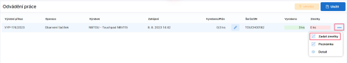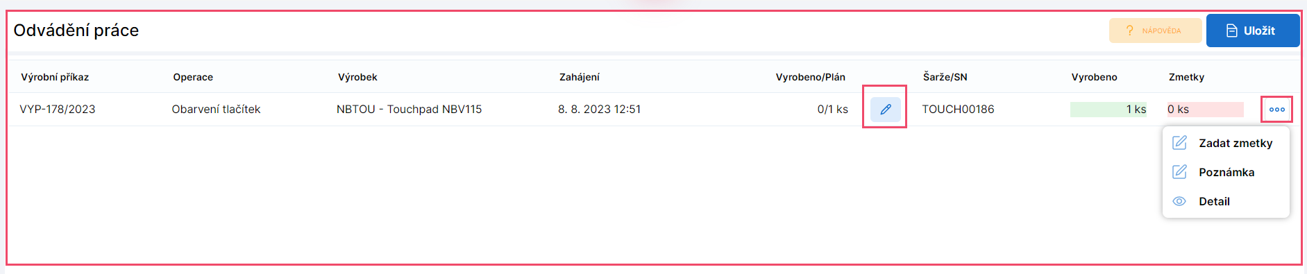 Odvod práce - zadní SN nebo šarže pomocí ikony s tužkou. Přes tři tečky je možné otevřít další nabídku na zadávání zmetku, poznámky nebo vstupu do detailu.