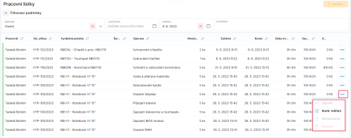 Pracovníci výroby vidí jen své vlastní pracovní lístky bez možnosti editace, zatímco mistr výroby vidí všechny Pracovní lístky, má povolené je editovat, mazat a může si je filtrovat za jednotlivé pracovníky (pokud je fulltextové hledání nastavené i přes pracovníky).