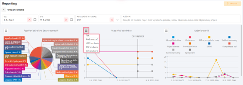 Obrazovka je dostupná samostatně z nabídky dostupných obrazovek aplikace v levé části (přes ikonu "hamburgeru"). Hlavním prvkem je nahoře umístěný filtr, kde jsou umístěna jednotlivá filtrační kritéria, podle kterých se následně v grafech níže zobrazují data.