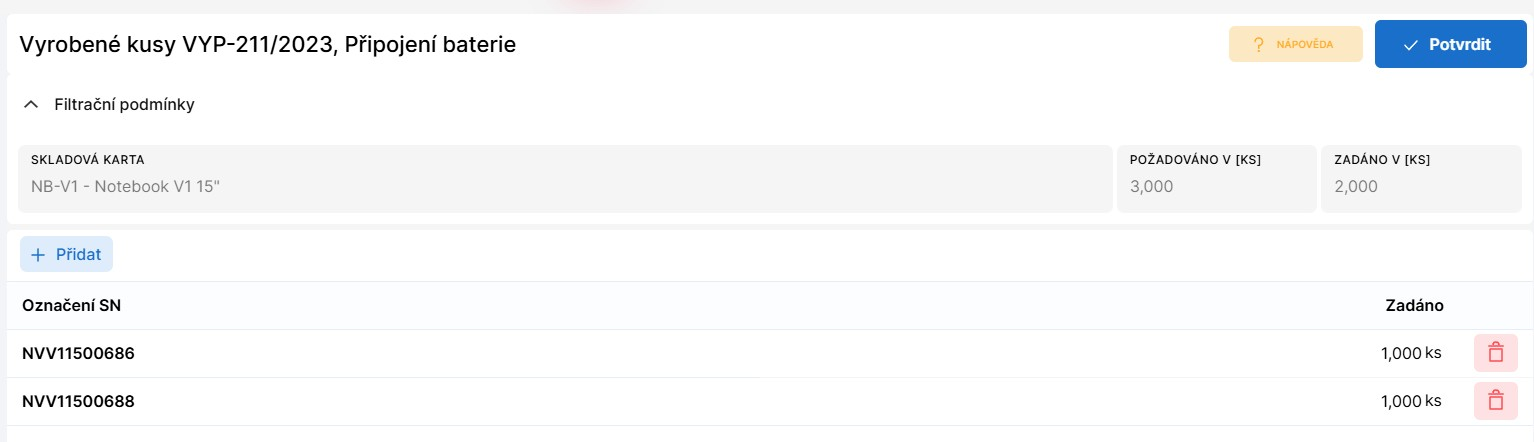 Zadané šarže/sér. čísla z výběru výše jsou pak vidět na seznamu, kde je možné je případně smazat.