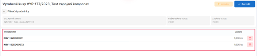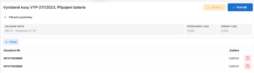 Vybrané šarže či sériová čísla se následně zobrazí v seznamu, kde je možné podle potřeby vybranou šarži/SN vymazat ikonou nebo v případě šarží editovat množství.