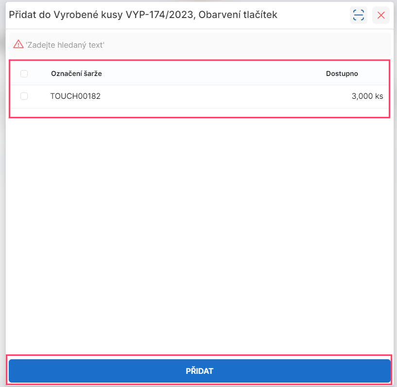 To po kliknutí zobrazí seznam dostupných šarží/sér. čísel, ze kterých vybereme potřebné hodnoty, a výběr potvrdíme tlačítkem Přidat.