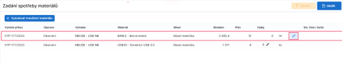 U materiálů s evidencí šarží/sériových čísel nelze spotřebované množství editovat přímo, ale je potřeba vybrat šarže/SN na obrazovce šarže/SN, na kterou se uživatel dostane kliknutím na ikonu tužky