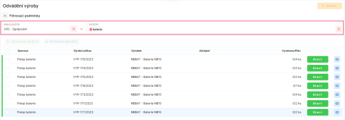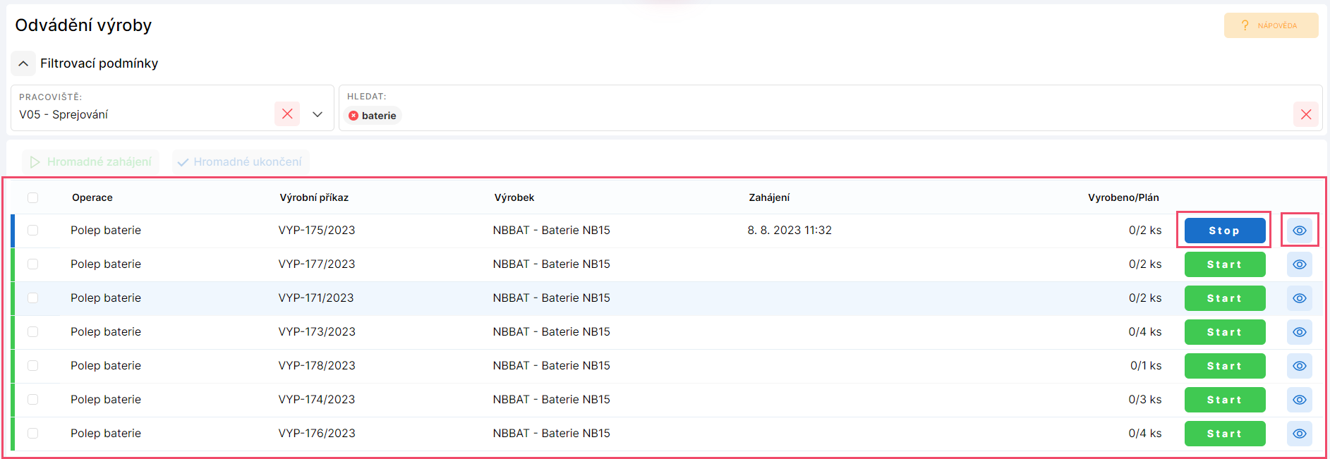 Ve spodní části je seznam operací odpovídajících aktuálním filtrovacím podmínkám. Datovým zdrojem pro tuto tabulku jsou data z agendy Dílenský plán. Parametrem lze nastavit, jestli se mají operace odvádět typem odvodu Start-stop nebo Po skončení. V případě typu Start-stop lze jednotlivé operace spouštět tlačítkem Start a ukončovat po ukončení práce na dané operaci tlačítkem Stop. Zda může být spuštěna jen jedna operace nebo souběžně více operací, případně jestli je možný hromadný odvod více operací najednou, určují Uživatelské parametry. Ve výchozím stavu je umožněno spuštění vždy jen jedné operace. Nastartované operace jsou zobrazené vždy na prvních pozicích tabulky, přičemž mají místo tlačítka Start tlačítko Stop.