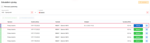 Tabulka obsahuje seznam operací k odvodu. Pokud se jedná o ukončující operaci výrobku s evidencí šarží/sériových čísel, nelze vyrobené množství editovat přímo, ale je potřeba vybrat vyráběné šarže/SN na obrazovce Šarže, na kterou se uživatel dostane kliknutím na ikonu tužky