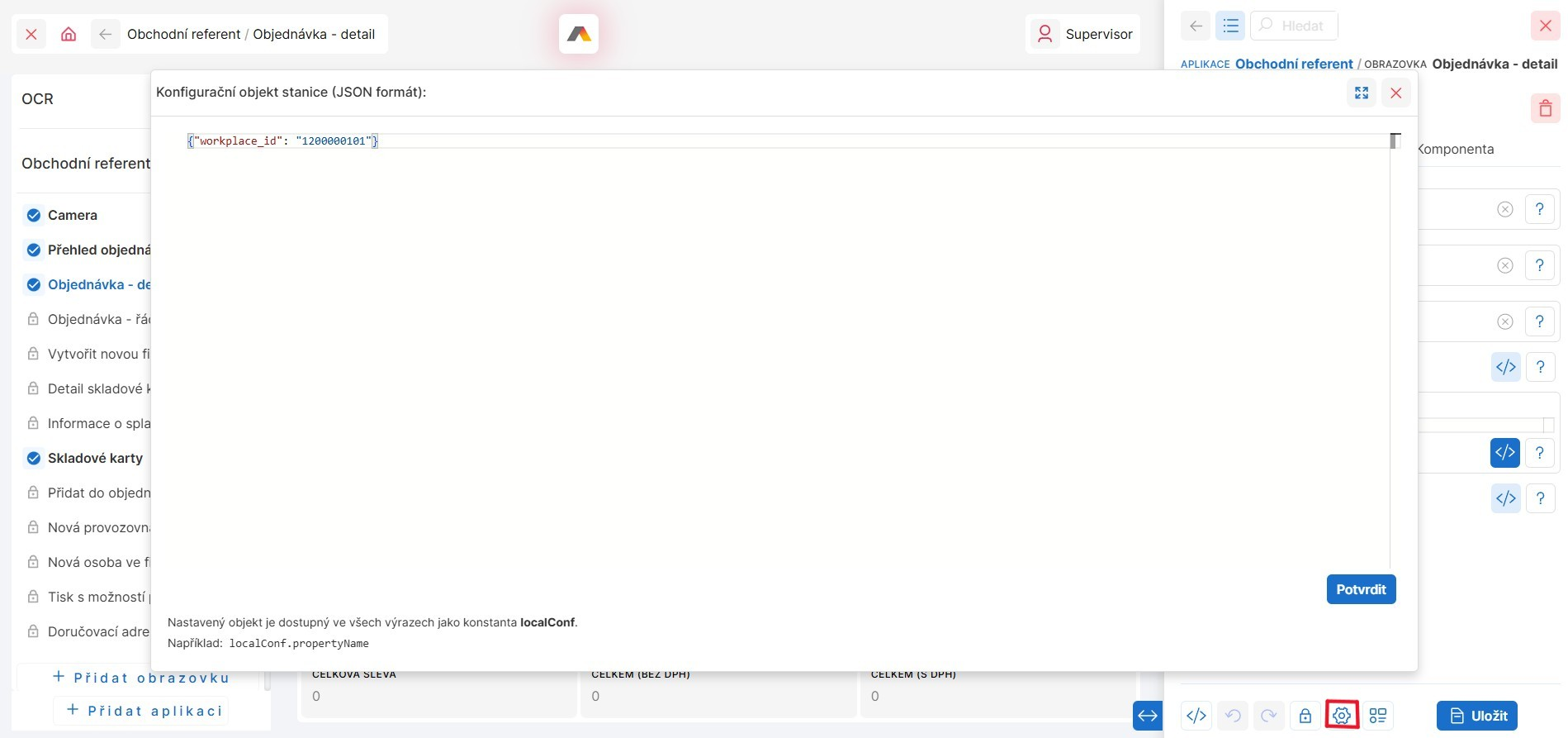 Editační režim a otevřen nastavení: Konfigurační objekt stanice. Doplníme "workplace_id" s vyplněným ID pracoviště.