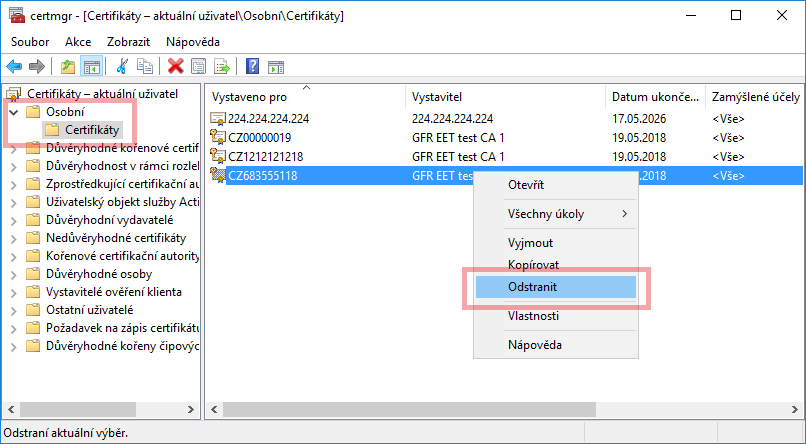 V případě zkompromitování certifikátu je vhodné jej zablokovat na portálu EET a odstranit jej z počítače: