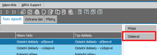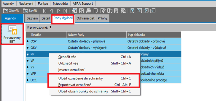 Spusťte agendu Provozovny EET a přejděte do záložky Řady dokladů. Klávesovou zkratkou ctrl+A označte všechny záznamy v agendě. Buď volbou ctrl+alt+E nebo ctrl+C (pracujete-li na terminálu, kde na svém PC nemáte nainstalovaný MS Excel) přeneste a zálohujte seznam používaných řad do Excelového souboru. Po označení všech záznamů je možné záznamy uložit do schránky, nebo je rovnou exportovat. Soubor si uložte pro budoucí obnovu nastavení. Následně stačí stisknout tlačítko Odebrat: Stiskme tlačítka Odebrat provedete odebrání označených řad dokladů. Tuto akci zopakujete pro všechny svoje EET provozovny. Řady dokladů z každé provozovny si uložte do jiného listu v excelu. V okamžiku, kdy budete v budoucnu chtít platby v EET opět evidovat, stačí řady dokladů volbou tlačítka Přidat opět připojit. Pro snadnější uvedení do původního stavu vám pomůže archivovaný excelovský dokument, kde máte uloženo, jaké řady dokladů byly použity v dané provozovně. |