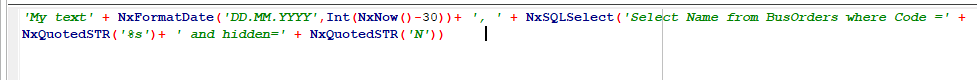 První je vlastní text uvedený v apostrofech. Následuje funkce pro formátování datumu, kde si určíme formát, v jakém potřebujeme datum vracet. Dále je převod datumu na číslo a funkce NxNow vrátí aktuální datum v číselné podobě, které ponížíme o 30 dní. V následujícím SQL dotazu zjišťujeme název zakázky podle jejího kódu, který je v importních datech obsažen. Díky tomuto výrazu bude importovaný text vypadat například tak jako na obrázku níže: |