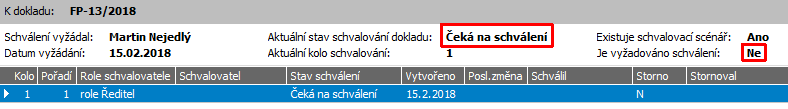 Na dokladu vidím, že se nachází v procesu schvalování, ale v hlavičce je u položky "Je vyžadováno schválení" uvedeno "Ne", viz obrázek. Co to znamená? |