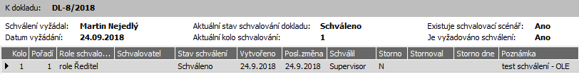 Tato nesrovnalost je pouze zdánlivá. Situaci konkrétního dokladu zcela spolehlivě zachycuje "Aktuální stav schvalování dokladu", který je odvozen od posledního kroku schvalovacího procesu a je vždy aktuální. Údaje "Existuje schvalovací scénář" a "Je vyžadováno schválení" se nevztahují ke stavu konkrétního schvalovaného dokladu, ale ke stavu schvalovacích scénářů: