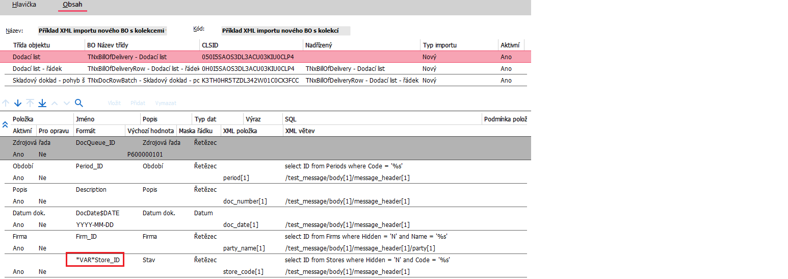 Na tomto příkladu je demonstrováno využití proměnné *VAR*Store_ID definované na hlavičkovém business objektu a její následné využití na řádku BO (dosazení do položky „Výchozí hodnota“).