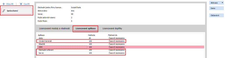 Licence pro ABRA Apps je dodávána samostatně. V agendě Správa licencí aktivujete licenci doplněnou o zakoupené aplikace.
