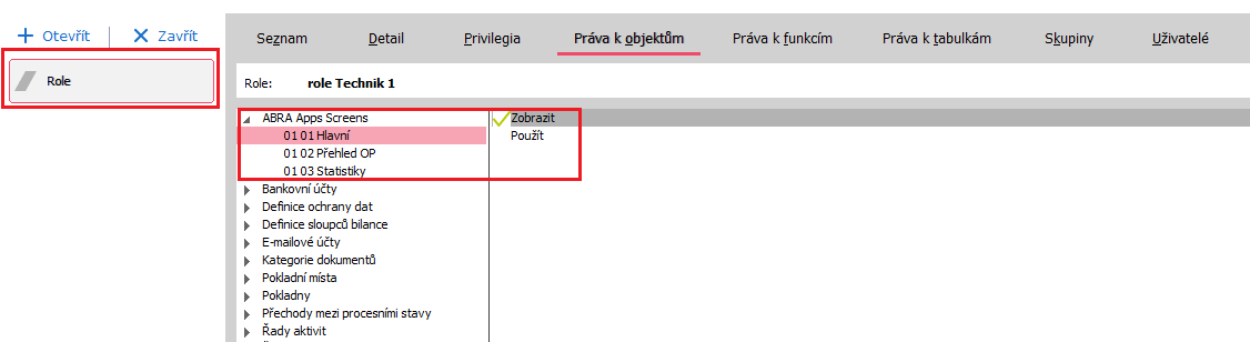 Nastavení práv pro jednotlivé obrazovky na Rolích nebo Skupinách rolí