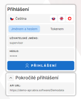 Přihlašovací okno ABRA Apps pro přihlášení uživatelů. V sekci Pokročilé nastavení je zobrazeno spojení na databázi v ABRA Gen.