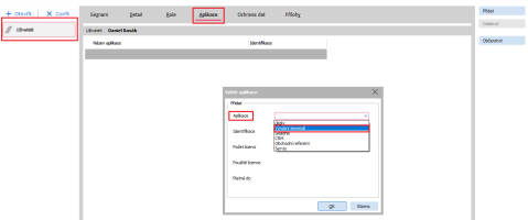 Aby bylo možné určit, který uživatel bude mít do aplikace přístup, je potřeba přístupy nastavit přímo v agendě Uživatelé. Na záložce Aplikace tlačítkem Přidat vyberete požadovanou aplikaci.