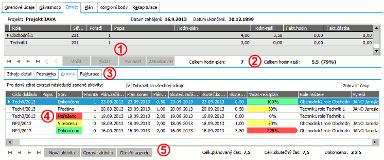 Je k dispozici pouze tehdy, pokud je provozováno projektové řízení a pro daný obchodní případ je zapnuto, viz co je třeba k provozu projektového řízení (v opačném případě nemá význam) a máte-li k zobrazení zdrojů v této agendě nastaveno přístupové právo Zobrazit zdroje. Slouží k zadání a zobrazení zdrojů (rolí) potřebných pro aktuální obchodní případ ze záložky Seznam, k zadání a evidenci aktivit pro konkrétní plánování využití těchto zdrojů a sledování jejich realizace a dále pro sledování, co již bylo fakturováno.