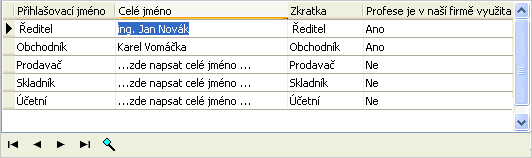 Pomocí tohoto kroku průvodce si můžete pohodlně upravit seznam vašich uživatelů. V rámci startovacích dat jsou dodávány předdefinované záznamy typických uživatelů - uživatelských profesí. Ke každému záznamu uživatele dodávanému v rámci startovacích dat je rovnou zadána jeho uživatelská role v agendě Role s přednastavenými přístupovými právy tak, jak se pro danou profesi předpokládá. Nemusíte tedy seznam vašich uživatelů definovat od začátku, zadávat k nim role a přístupová práva, ale můžete využít předpřipravených záznamů, k nimž jen doplníte potřebné údaje.