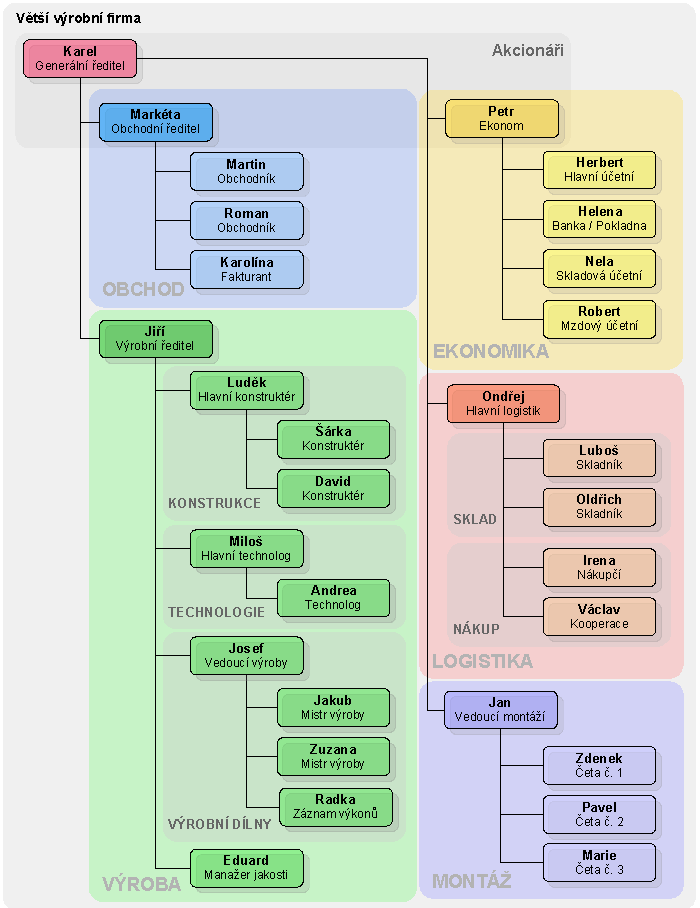 Hlavní konstruktér Luděk částí své kapacity zpracovává zakázky stejně jako ostatní konstruktéři. Podobně je na tom Hlavní technolog Miloš. Oddělení logistiky je rozděleno na dvě části, sklad a nákup. Tyto části nemají samostatného vedoucího, ale podléhají hlavnímu logistikovi. Oddělení výroba je členěno do dalších samostatných částí. Samotné oddělení výroby je daleko rozsáhlejší než v uvedené struktuře. Toto členění však není třeba z pohledu rolí a procesů rozkrývat, podrobnou evidencí této části firmy se zabývá ve svých agendách modul výroba. Markéta, Karel a Petr jsou kromě svých pracovních funkcí také akcionáři firmy a mají přístup ke všem ukazatelům a výkazům společnosti.