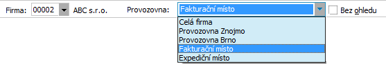 V zobrazeném seznamu je možno zobrazit si osoby bez ohledu na jejich přiřazení k nějaké firmě, nebo si tyto omezit jen za osoby přiřazené k vybrané firmě případně i k vybrané provozovně firmy. K tomu slouží první část omezovacího panelu v číselnících v horní části záložky Seznam. Buď zatrhnete předvolbu Bez ohledu na firmu, anebo zadáte hodnotu do číselníkové položky Firma - pak uvidíte seznam osob přiřazených k této firmě (bez ohledu na provozovnu) a v položce Provozovna se defaultně doplní hodnota Celá firma. Pokud budete chtít zobrazený seznam omezit pouze na osoby přiřazené ke konkrétní provozovně firmy, vyberete ji ze skrytého seznamu v položce Provozovna: