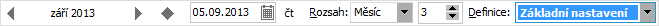 | Rozsah a počet | Položka typu skrytý seznam. Umožňuje vybrat den, týden nebo měsíc – při jeho změně dojde vždy ke znovunačtení dat. Po změně je zachován pouze fokus sloupce. Je možné zadat i počet zvolených časových intervalů, které se mají aktuálně načíst (např. pro zobrazení půlroku zvolíte 6 měsíců apod.). | ||||||