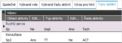 Konstrukce výrazů může být samozřejmě mnohem složitější a pomocí podmínek lze např. definovat různé hinty pro různé typy aktivit. Pokud si uživatel chce zjednodušit a zautomatizovat zadávání více různých typů aktivit přímo z této agendy, může si zde nadefinovat tzv. Typy zadání. U každého typu zadání definuje stejné položky jako na záložce Společné pro výchozí typ zadání. Navíc má ještě každý typ zadání vlastní název.