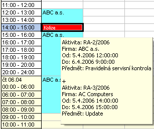 Pokud se aktivity překrývají, zobrazí se v časovém plánu informace o kolizi. Ke kolizní buňce se adekvátně zobrazuje i popisek (hint):