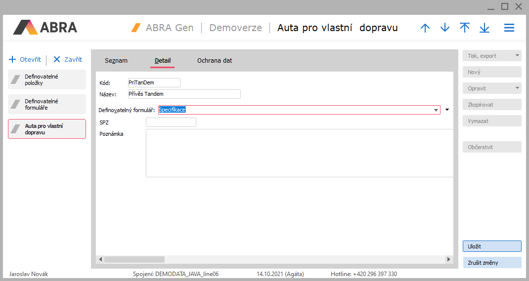 Nechť se firma kromě distribuce velkoobjemového zboží zabývá i jeho dopravou. Na prodejní doklady si chce evidovat, jaké auto si klient pro dopravu nakoupeného zboží objednal (nechce to ale uvádět v řádcích dokladu jako pouhý text, ani k tomu nechce využívat sklad. položky). U aut chce evidovat kromě kódu a názvu i SPZ a zapisovat si poznámky. Zatím žádné uživatelské číselníky nemá.