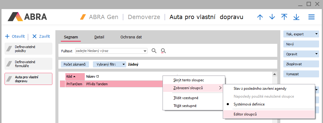 Nadefinovaný číselník má v seznamu zobrazovány pouze sloupce pro základní položky Kód a Název. Pro zobrazování sloupce s SPZ si nadefinujeme vlastní uživatelský sloupec. Nad seznamem vyvoláme Editor definic sloupců.