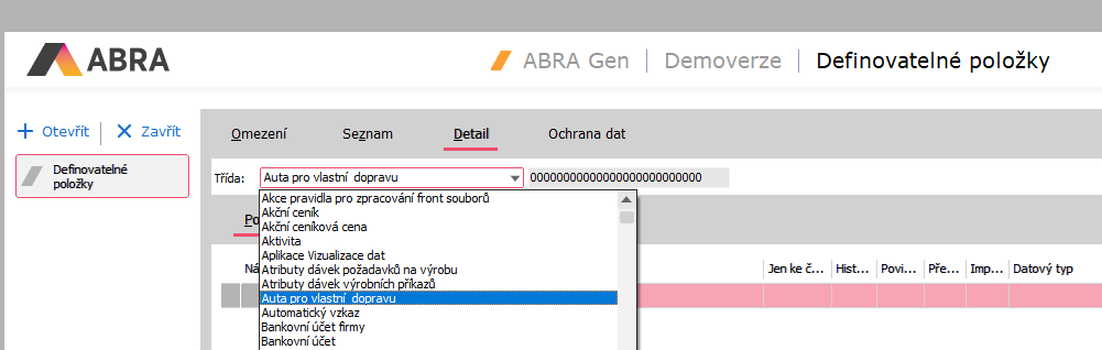 Takto nadefinovaný číselník má pro evidenci údajů pouze základní položky Kód a Název. Pro evidenci SPZ a poznámky si proto nadefinujeme vlastní uživatelské položky. V agendě Definovatelné položky vyvoláme funkci Nový a v položce Třída vybereme z nabízeného seznamu třídu našeho Business objektu:
