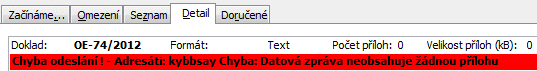 Informace týkající se stavu odeslání. Viz položka Stav. U odeslaného e-mailu resp. datové zprávyzobrazuje i Datum a čas, kdy byl daný e-mail odeslán. Tento údaj je doplněn automaticky v okamžiku odeslání e-mailu resp. datové zprávy a uživatelsky jej zadat nelze. Pokud je stav Chyba odeslání, zobrazuje se zde i kód a text chyby, ke které při odeslání došlo.