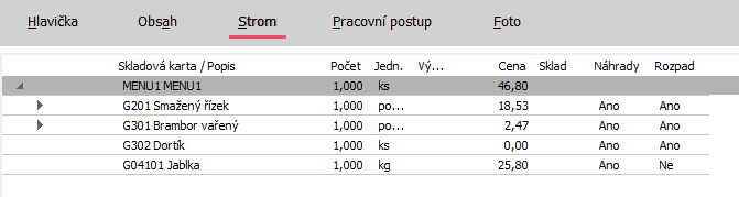 a) V normě pro Menu1 nastavíme Rozpad=Ano u položek, u nichž to lze (nepůjde to u Jablek, jelikož nejde o výrobek (skl. kartu s příznakem Výrobek=Ano)). Pak je strom zobrazen následovně: