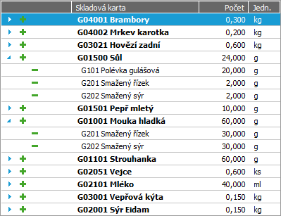 Příklad stromu ve výrobních listech. Ve stromu jsou tučně vyznačeny vyráběné položky ze záložky Obsah (zde se jedná o kartu Smažený řízek, brambor). Dále jsou tučně zvýrazněny změny provedené proti normám: Vepř. kýta byla nahrazena Vepř. kotletou, byl přidán Pepř mletý a počet u Vejce byl zaokrouhlen na celé množství 1ks. Adekvátně se změnily i ceny.