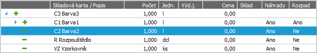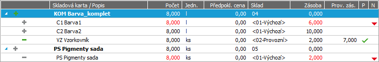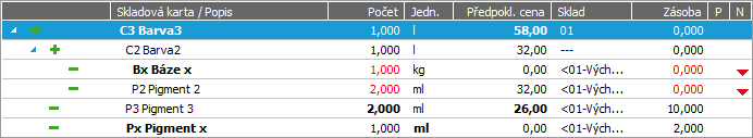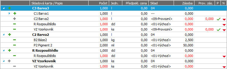 - červeně - platí pro položky nepokryté skladem, tedy s nedostatečnou sklad. zásobou (příznak nedostatečné zásoby surovin v záložce Strom).