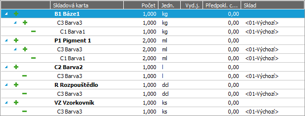 Mějme barvu Barva3. Nechť norma obsahuje Barvu1 (což je výrobek-polotovar s normou), Barvu2, což je výrobek s normou, dále Rozpouštědlo, což nechť je výrobek bez normy a k balíčku se přidává Vzorkovník, což nechť je materiál.