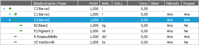 Kdy např. použijeme Rozpad=Ne a změnu rozpadu a Vyrábět=Ne: Mějme Barvu_komplet podobnou "Barvě3" z Příkladu 1, ale bez Rozpouštědla. Budeme předpokládat, že namíchané Barvy1 i Barvy2 budeme mít připravenu předem, v normě Barva_komplet je tedy už vyrábět(míchat) nebudeme (nastavíme proto Rozpad=Ne). Dále nechť plánujeme prodej kompletu, kde chceme přidávat i sadu pigmentů, která se nevyrábí, ale nakupuje se od dodavatele. Zde je praktické si všechny položky (i nevyráběnou sadu pigmentů) připravit už na KL, aby se pak celý dal naimportovat do dodacího listu a obsluha vystavující DL na vydané komplety jej mohla vystavit importem KL a nemusela na sadu pigmentů myslet a přidávat ji až do DL ručně. Sady pigmentů se tím dostanou jednak mezi materiály, aby byly nafasovány ze skladu a zároveň i mezi výrobky, aby je prodavač správně vydal.