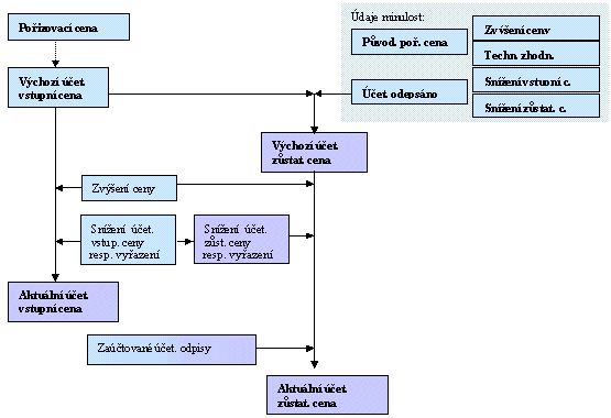 Následující schéma znázorňuje situaci na kartě majetku. Tučně jsou zvýrazněny ceny přímo pamatované na kartě majetku.