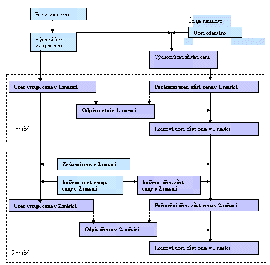 Následující schéma znázorňuje situaci v agendě odpisů a to pro první dva měsíce odepisování (situace v dalších měsících probíhá shodně.) Tedy z výchozích cen zadaných nebo vypočtených na kartě vyjdou vstupní cena a počáteční cena zůstatková, tj. cena před odpisem (viz schéma pro 1.měsíc). Podle algoritmu odpisů je příslušná z nich použita pro vyčíslení odpisu (vyčíslí se roční, ten je pak rozpočten do měsíčních). Cena po odpisu je pak Koncová zůstatková cena v daném měsíci.