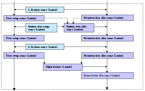 Pokud v daném měsíci došlo ke zvýšení resp. ke snížení ceny, pak se toto promítne jak do vstupní ceny v daném měsíci, tak do počáteční ceny zůstatkové v daném měsíci (viz schéma pro 2.měsíc).