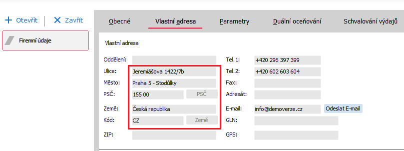 V agendě Firemní údaje zkontrolujte, zda máte na záložce Vlastní adresa správně vyplněnou adresu, včetně kódu země (CZ).
