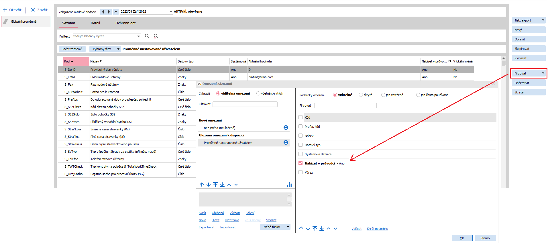 Pro snazší orientaci v seznamu globálních proměnných můžete seznam omezit na proměnné, které se nabízejí v Průvodci nastavením mezd: Nastavit filtr alt+F11 → Nabízet v průvodci → Ano → OK.