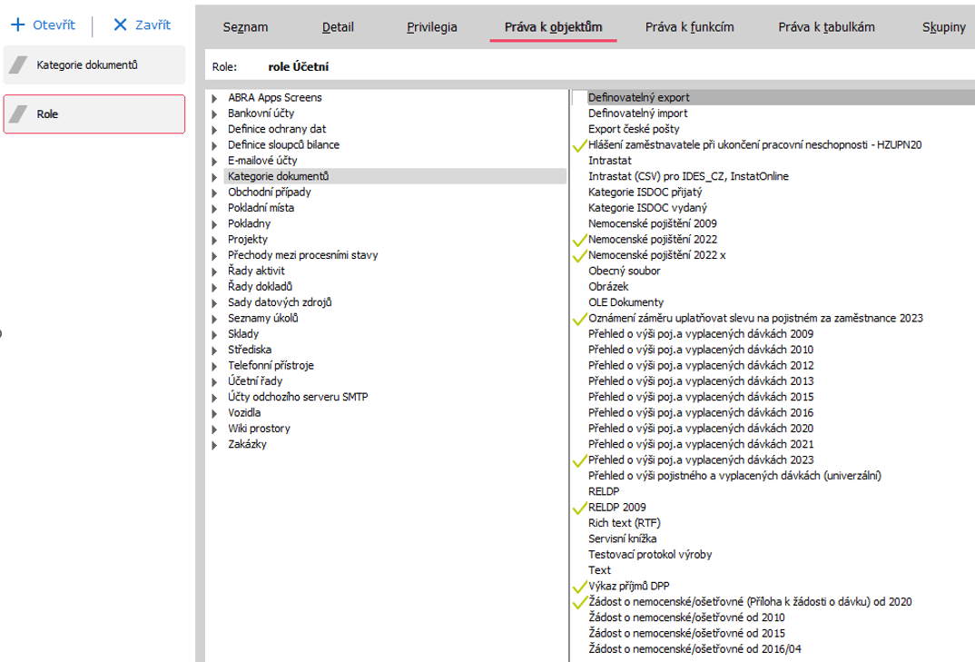 Ke kategoriím dokumentů předávaným ČSSZ (na obrázku jsou zatrženy) je zapotřebí příslušnému uživateli přidělit právo Zpracovat.