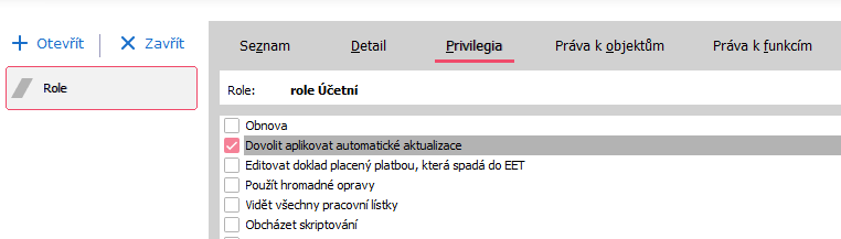 Uživatel, který automatické aktualizace stahuje a instaluje, potřebuje speciální privilegium Dovolit aplikovat automatické aktualizace, které naleznete v agendě Role nebo Skupiny rolí na záložce Privilegia.