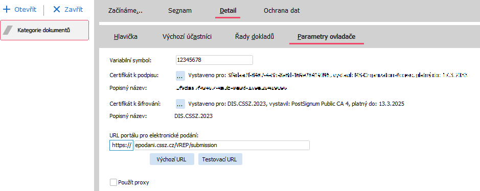 Nastavení parametrů ovladače v agendě Kategorie dokumentů.