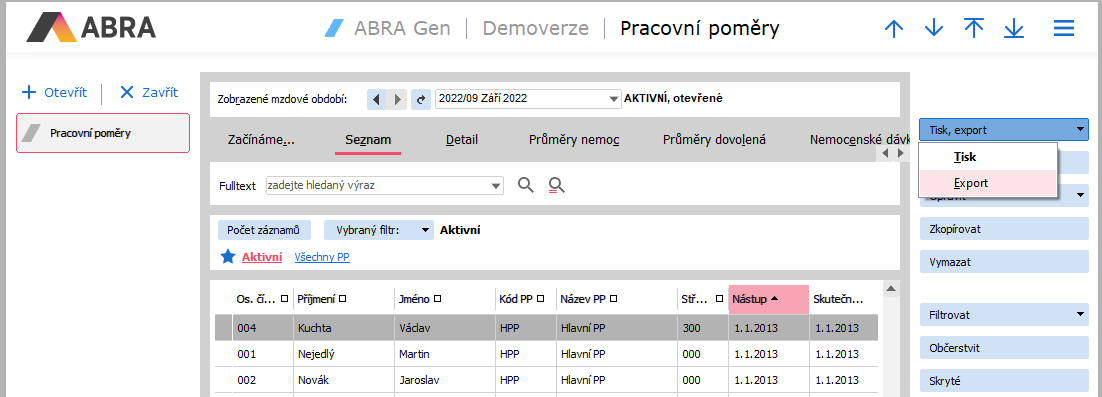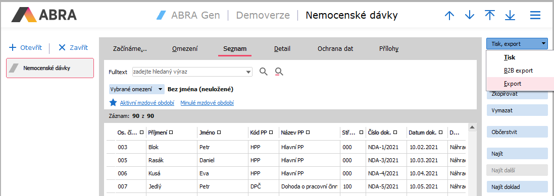 - V příslušné agendě (Nemocenské dávky (NDA), Pracovní poměry, Doklady ELDP, Mzdové listy (MLD, MLS)) přejděte na záložku Seznam a z nabídky funkčního tlačítka s volbou Tisk zvolte možnost Export.