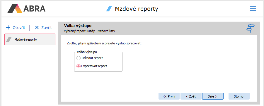 V příslušné agendě (Nemocenské dávky (NDA), Pracovní poměry, Doklady ELDP, Mzdové listy (MLD, MLS)) použijete funkční tlačítko s volbou Tisk, z jehož nabídky vyberete možnost Export.