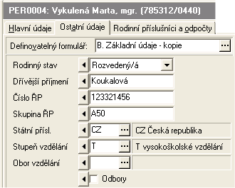 Příklad upravené kopie dodávaného vstupního formuláře zobrazený v agendě Zaměstnanců v záložce Ostatní údaje
