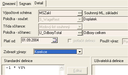 Definice nové součtové položky definované k doplatku mzdy - v korekčním výrazu je násobek -1, tj. položka se bude odečítat od doplatku.